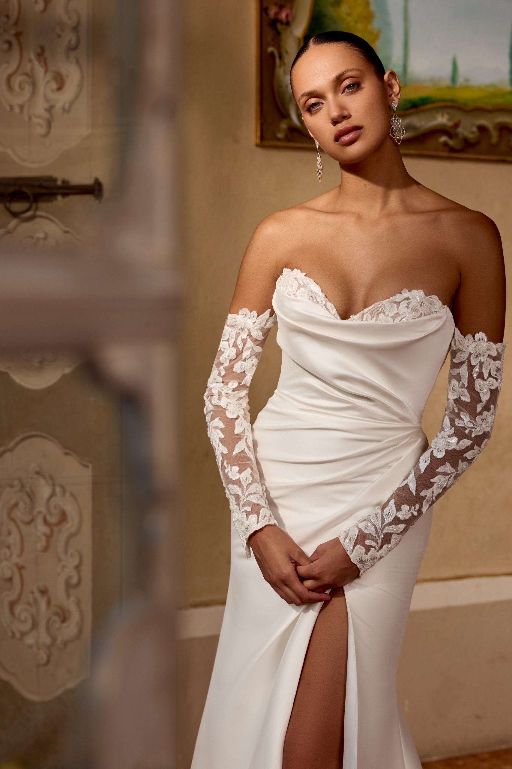 Stretch Mikado Fit and Flare Gown with Peek-A-Boo Neckline